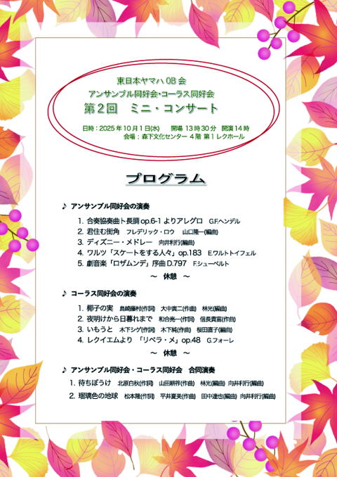 10月1日、江東区森下文化センターで昨年に引き続き、アンサンブル同好会とコーラス同好会による第2回ミニコンサートを開催。